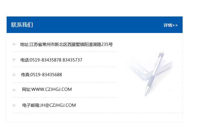 地址:常州市新北區友邦商務大廈1幢16、17層  電話:0519-85101652  傳真:0519-85112595  郵編:213022  網址:www_cz-jiayue_cn.chsensing.com  郵箱:xiajifengaa@163.com
